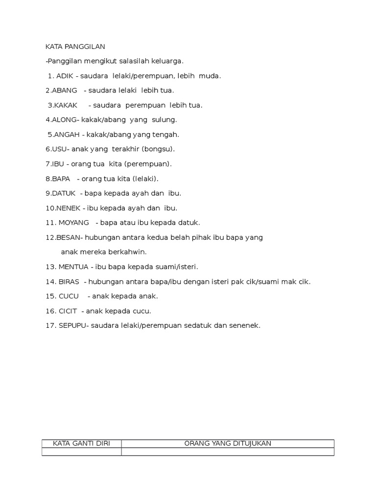 Bahasa yg menurunkan bahasa yg sekerabat msl bahasa Latin merupakan rumpun bahasa dr bahasa Italia Prancis Portugis Romania dan Spanyol. Selalu kita panggil datuktok atau neneknek saja. Dan kisah ni berkenaan ayah kepada Moyang TOK NANG.
